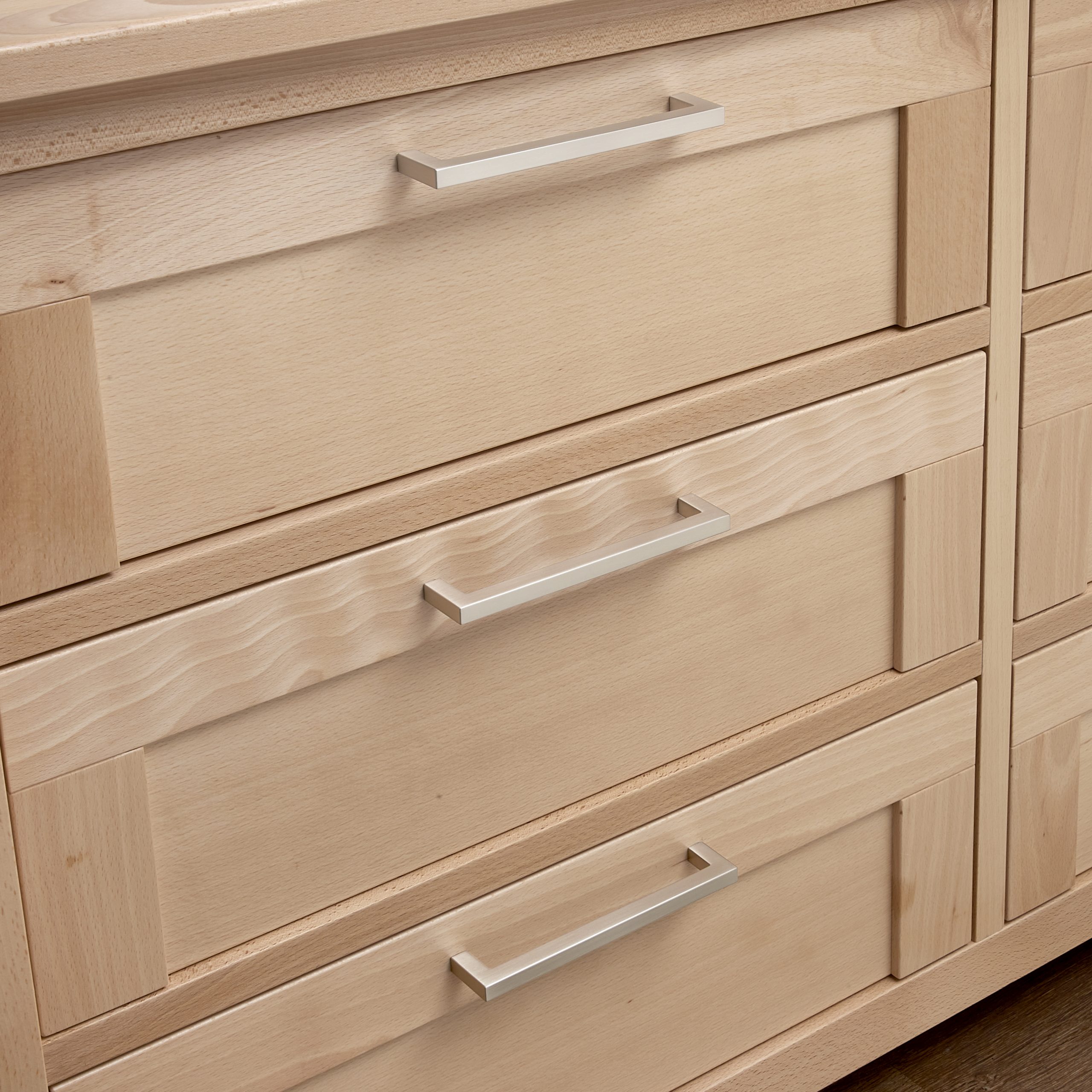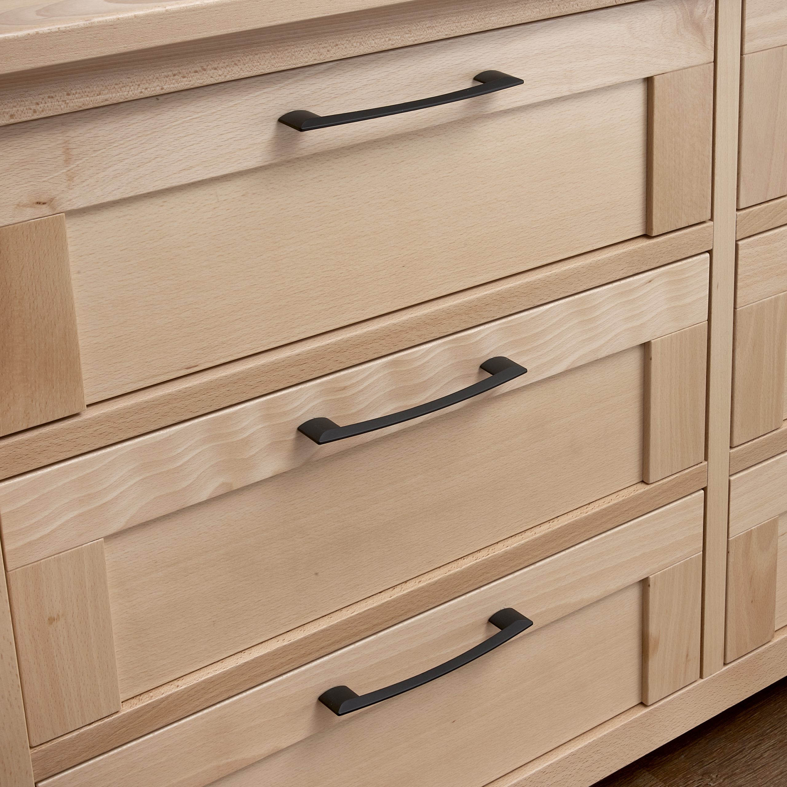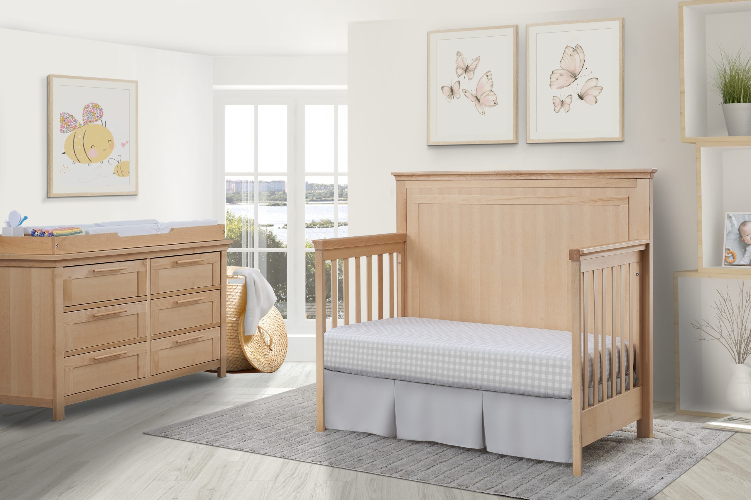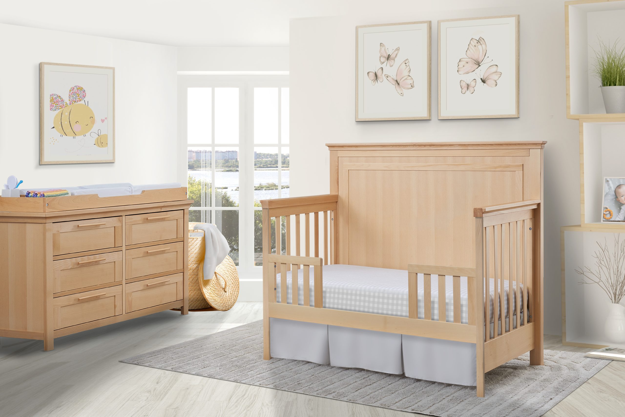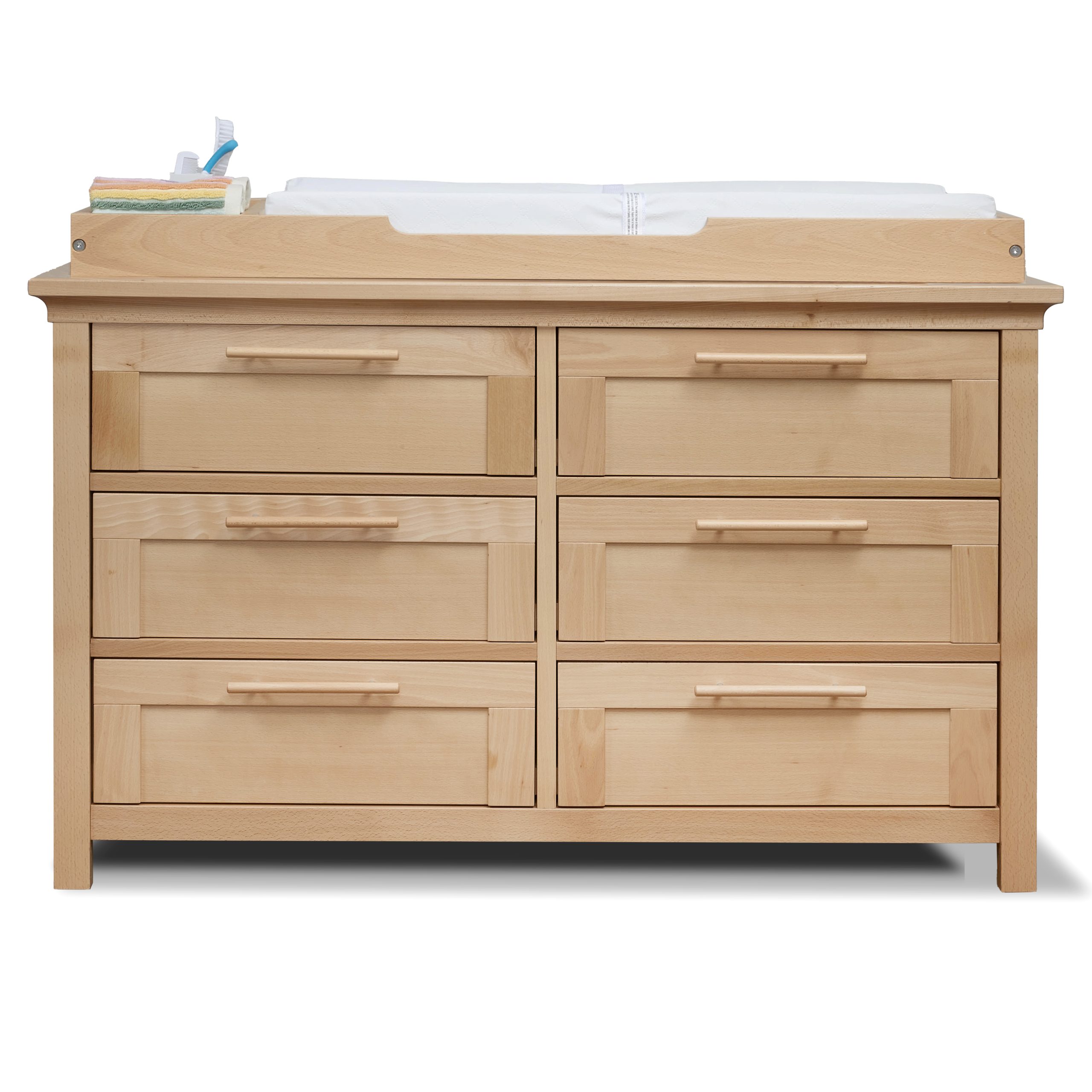 Bundle set including the Luna Crib, Luna Double Dresser and topper. Made in Italy of solid Beech wood. The double dresser features undermounted soft closing runners and includes 2 sets of handles, wooden and metal.